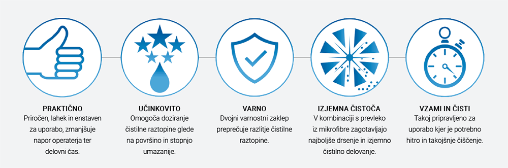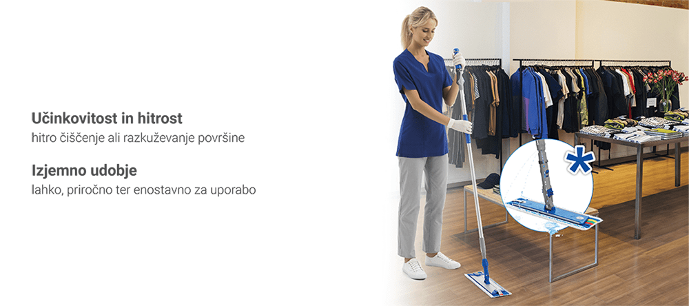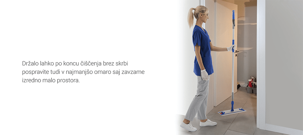 Ergonomsko oblikovano držalo omogoča enostavno in intuitivno uporabo, zmanjšuje obremenitev zapestja ter omogoča pravilno držo med čiščenjem. 360-stopinjska rotacija držala in ergonomska zasnova sklepa za čistilno krpo zagotavljata zdravje in dobro počutje operaterja ter preprečujeta nastanek mišično-skeletnih težav. Tako se zmanjšajo neželeni gibljaji zapestja, kar ima pozitiven vpliv na preprečevanje utrujenosti in poškodb.