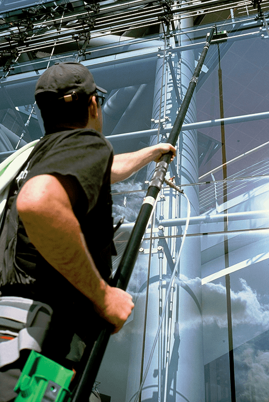 Poleg klasičnih preizkušenih metod čiščenja vam predstavljamo sistem za pomivanje z demineralizirano vodo, sistem Hydro Power HiFlo. Sestavljen je iz enote za demineralizacijo vode, lahkih teleskopov za doseganje višin in ustreznih ščetk in šob za čiščenje steklenih površin ali fasad. Sistem Unger ima izredno čistilno moč brez uporabe čistil, površina pa po čiščenju ostane brez madežev in lis.