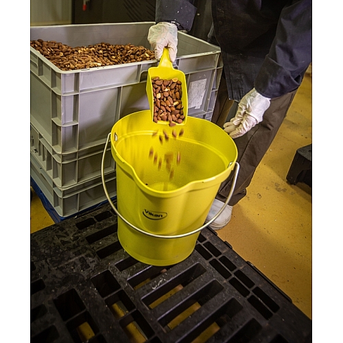 LOPATICA ROČNA VELIKA, 2l. Narejena iz materiala, ki ga lahko zaznamo pod detektorjem kovin. Lopatica s prostornino 2 litra. Ergonomsko oblikovana, lahka in vzdržljiva. Brez težav lahko z njo zajemamo sestavine iz manjših vrečk (npr.: začimbe, moka, riž, led…). Narejena zelo robustno in lahko zdrži močan pritisk. Gladka površina omogoča izredno enostavno čiščenje. Idealna za uporabo v proizvodnji hrane za premikanje sestavin.