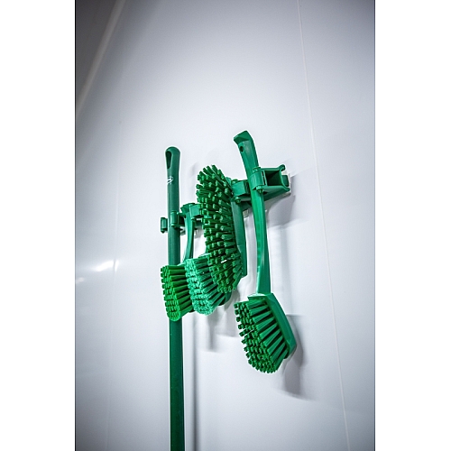 Higienski modularni stenski nosilec oziroma obešalnik, ki zagotavlja prilagodljivo rešitev za shranjevanje vašega čistilnega orodja in pripomočkov na katerem koli delu vašega delovnega mesta. Tirnico enostavno pritrdite na 4 stenske nosilce tako, da jo potisnete z desne ali leve strani. Module Grip Band (oprijem) in Modul Hook (kljuka) lahko nato kliknete na tirnico in jih "zaklenete" na mestu z uporabo ene od številnih majhnih "zarez" v tirnici. To zagotavlja, da moduli ne morejo drseti z ene strani na drugo. Na tirnico je mogoče namestiti in največ 5 modulov za oprijem (VIK1013) ter do 10 modulov kljuka (VIK1012) Modul za oprijem lahko drži izdelke s premerom 28-33 mm. Modul kljuka lahko sprejme izdelke, težke do 3 kg. V kompletu so 3 moduli za oprijem in 2 modula s kljuko ter nosilec ali tirnica. Obešalnik se enostavno razstaviti za čiščenje ali zamenjavo.