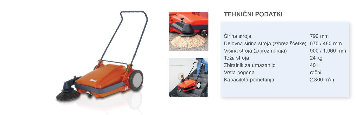 Stroj za pometanje na ročni potisk. Narejen je iz kovinskega ogrodja in dobro ščiti pred udarci. Nastavljiva stranska ščetka. Enostaven za transport in shranjevanje.