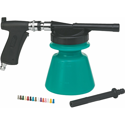 S PRŠILNIKOM ZA PENO S PRŠINO PIŠTOLO, in rezervno posodp za kemikalije z volumnom 1,4l nanašamo penilno sredstvo na površine s stalnim odmerkom kemikalij (0,4–10 %, odvisno od priporočil proizvajalca). Zdrži 8 barov pritiska in ima ergonomski oprijem, ki ne zdrsne, tudi ko je moker. Vsaka različica je na voljo v 5 barvah in ima komplet 15 barvno kodiranih šob za različne koncentracije kemikalij. Nikoli ne dovolite izpusta kemikalij neposredno skozi pištolo za penjenje.