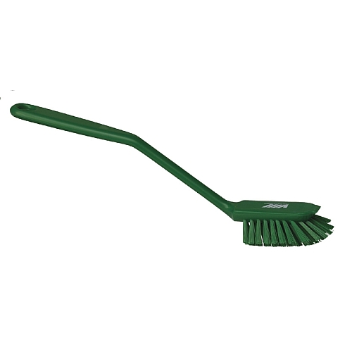 ŠČETKA ROČNA ZA POSODO, srednje trda, 280mm s strgalom. Ščetine so nameščene pod kotom in zato z njo sežemo brez težav v vogale. Zelo ergonomična.