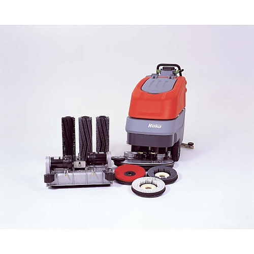 - Pogon ščetk: rotacijske ali valjčne ščetke poganjajo vodoodporni elektromotorji. Pritisk ščetk se lahko povečuje v primeru večje umazanosti preko stopalke (CL z rotacijsko ščetko).