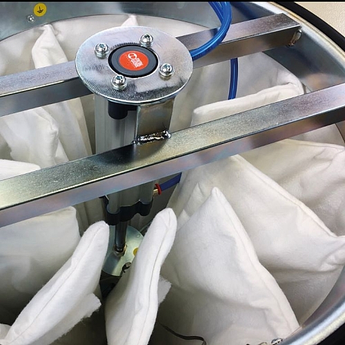 Na eni strani filtrske komore je ergonomski ročni stresalnik, s katerim lahko operater enostavno in hitro očisti filter ter odstrani prah in umazanijo z njegove površine. Zahvaljujoč temu pametnemu čistilnemu sistemu lahko operater nadaljuje z delom brez potrebe po zamenjavi ali pranju filtra.