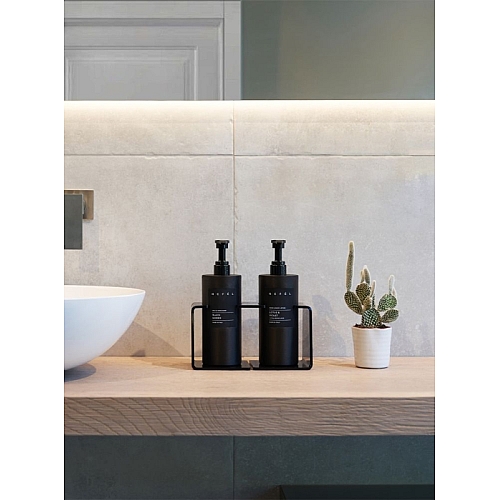 Praktično in elegantno stojalo iz pleksi stekla, idealno za namestitev dveh nosilcev z dozirnikom 480 ml.