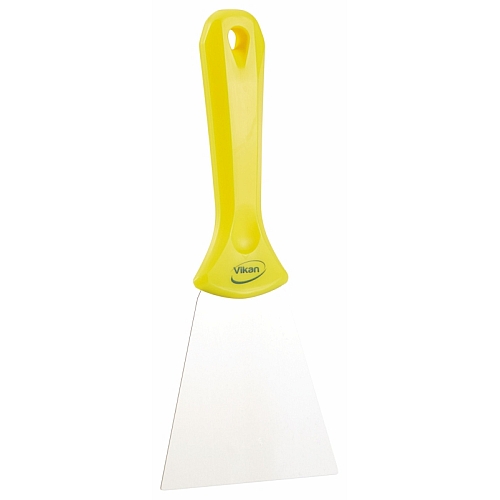 STRGALO ROČNO, 100 mm. Strgalo z širokim rezilom iz nerjavečega flex jekla, ki omogoča strganje lepil, zažganih ostankov hrane ter drugih trdovratnih nečistoč. Rezilo ima zaobljene konice, da prepreči poškodbe materiala. Držalo je ergonomično oblikovano z nastavkom za prst, za lažji oprijem.