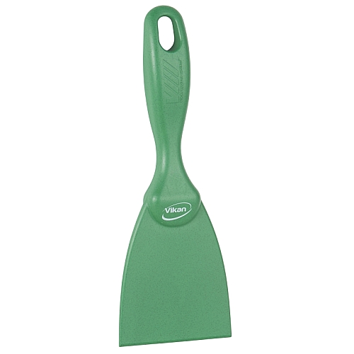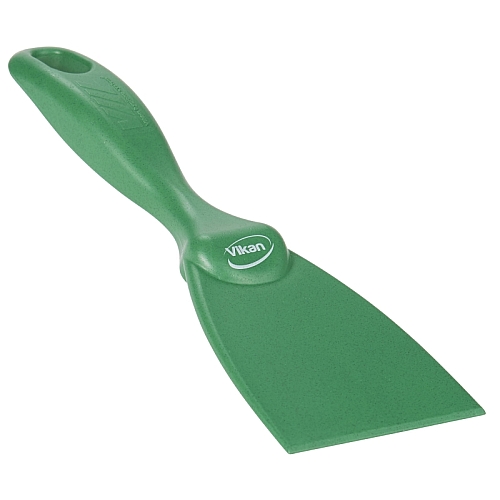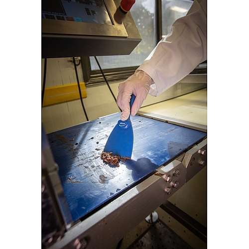 To ozko ročno strgalo, zasnovano za čiščenje majhnih prostorov in okrogle opreme, kot so velike sklede, je idealno za rahljanje trdovratne umazanije, vključno s pecivom, čokolado in zažgano hrano. Rezilo je naostreno na obeh straneh za dodatno dolgo življenjsko dobo. Narejen je iz materiala, ki ga je mogoče zaznati z detektorjem kovin.